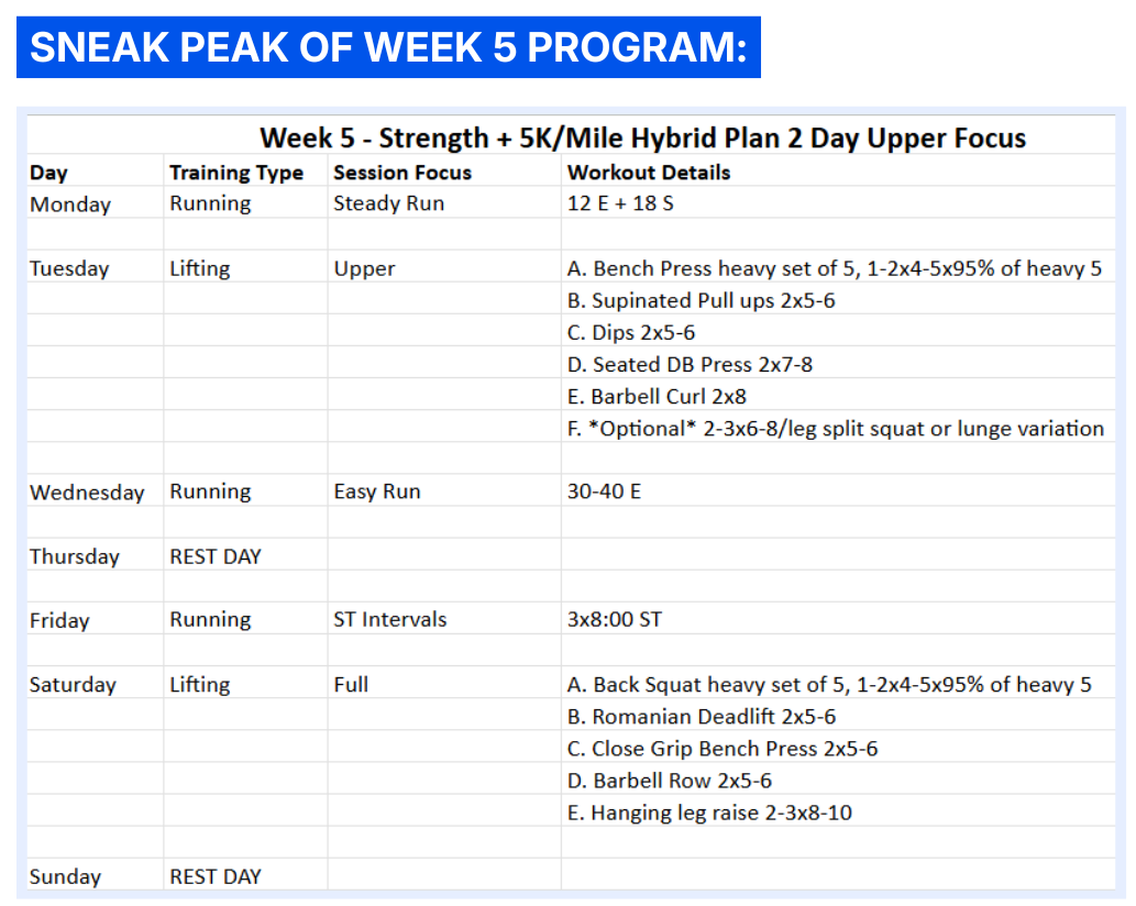 The structure: lift 2-3 days, run 3 days, follow the plan, get faster and stronger.